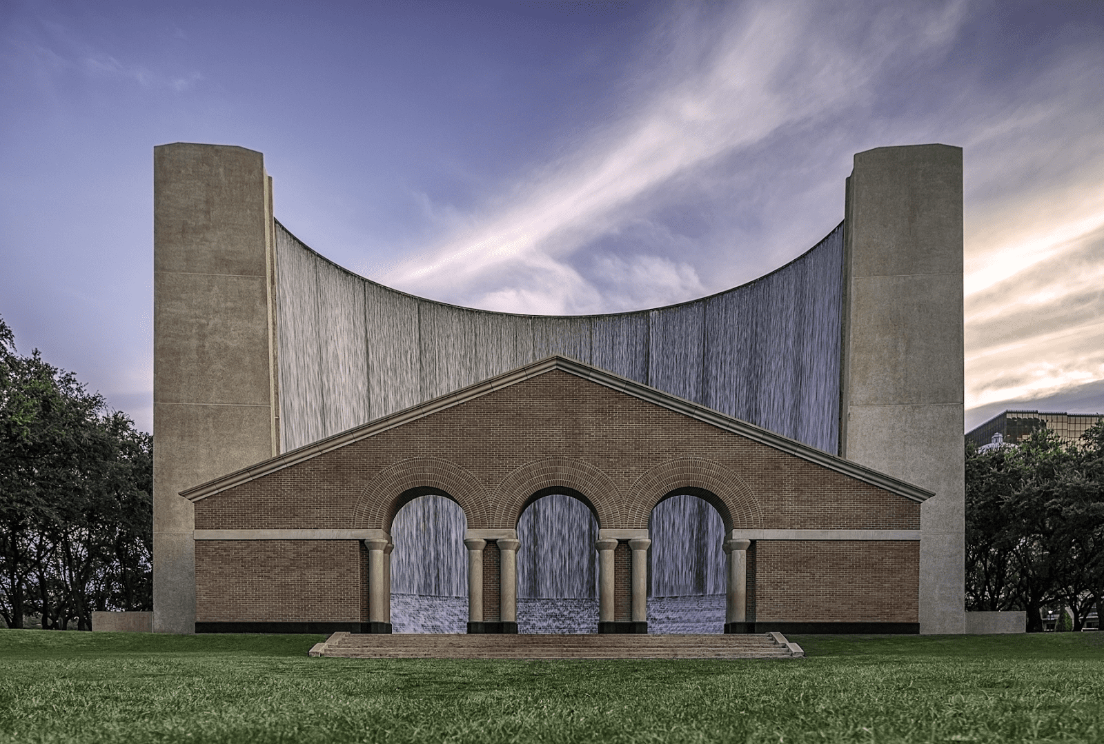 U-образный фонтан в виде водной стены был спроектирован и создан Джоном Берджи и Филипом Джонсоном. Вокруг фонтана растет большое количество дубов, тем самым дополняя локацию.