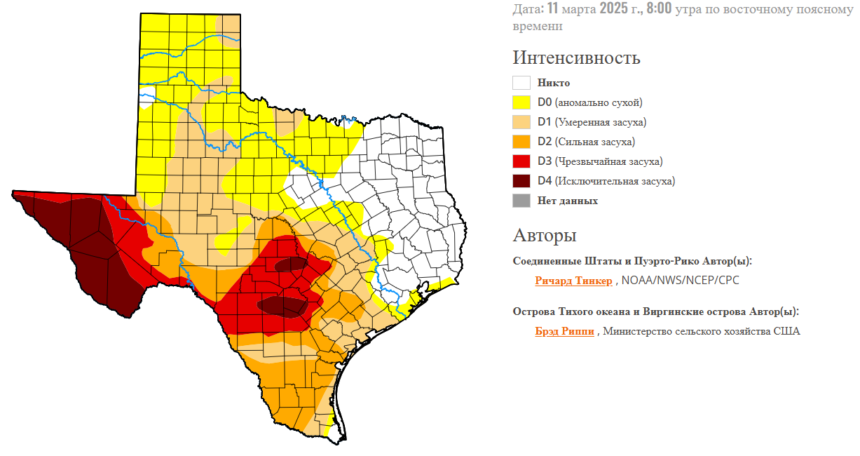 Как видно из таблицы, с каждым годом температура воздуха увеличивается. По данным Space City Weather, почти 20% территории штата переживает сильную засуху. Это плохо влияет на аграрный сектор региона. Привычный алгоритм выращивания различных культур нарушается из-за значительных засух. Посевы приходится дополнительно поливать. Это значительно влияет на уровень воды в водоемах. Приходится экономить живительную влагу из рек. Засухи побудили власти округов внедрять различные меры для смягчения последствий. Среди них даже такие радикальные как запрет открытых костров и ограничение использования воды.